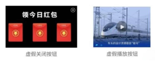 利用用户通常行为习惯和认知,设置不符合用户预期效果的按钮或提示,诱骗用户点击。通常体现为按钮体现的功能信息与实际“查看广告”的效果不符。