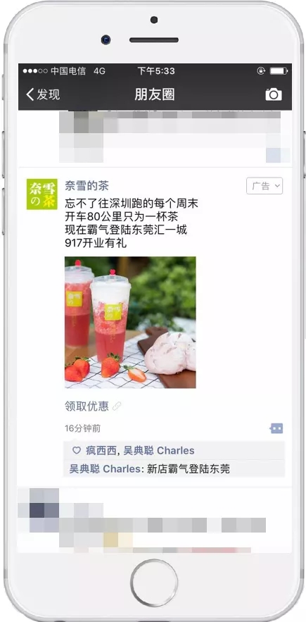 广告以“忘不了往深圳跑的每个周末,开车80公里只为一杯茶”为外层文案,直戳泛东莞地区用户对该产品的需求痛点,自然引出开店信息、活动,配合精致的经典霸气系列产品图片和“领取优惠”的文字链,吸引用户点击关注。