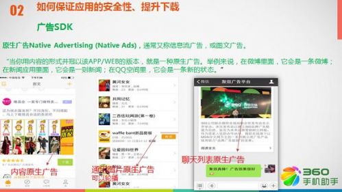 360手机助手还提供了最新的广告SDK服务,其中最受开发者欢迎的是“原生广告”,接入之后,通过完美贴合App的布局设计来呈现无缝的广告体验。原生广告形式有内容原生广告、图片原生广告以及聊天列表原生广告等,多种合作模式为开发者提供更多选择。