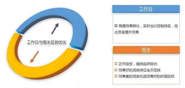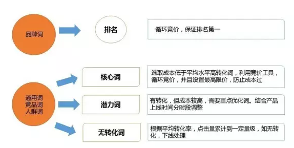 在进行投放时,通过地域、工作日及周末时间的筛选有针对性的覆盖需求客户,对于营销过程中高流量、高消费、高转化的关键词进行单独监控,持续关注,针对不同关键词组采取不同的针对性投放策略,品牌词始终保证第一位展现,其他词类则根据数据积累分为核心词、潜力词、无转化词等,针对性的采取优化策略,提升转化率。