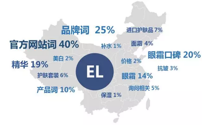 通过360大数据平台分析的雅诗兰黛相关检索词中,围绕雅诗兰黛核心的关注点集中在“官方网站”和“品牌词”两个方面,此类人群是品牌需要覆盖到的核心人群。在对不同人群的搜索分析中,检索雅诗兰黛相关词的人群中还有19%会检索精华一类的词,20%也会检索眼霜口碑词,这些通用词检索人群也是品牌不容忽视的潜在用户。