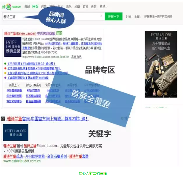 针对核心人群:用户直接检索“雅诗兰黛”相关词、对雅诗兰黛产品已经产生购买意图,通过品牌专区+品牌词形成首屏全覆盖,多渠道流量收口,并对竞品截流做到防守,紧抓核心人群,直接引导销售转化。