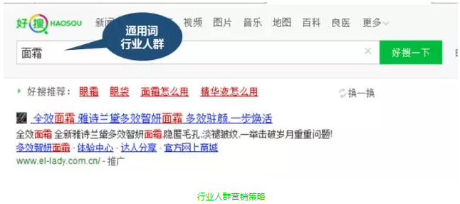 针对行业人群:处在比较或咨询阶段、对产品有需求却尚未明确购买品牌的行业人群, 360推广采用通用词+品牌甄选的方式,覆盖行业人群,通过甄选样式扩大展示面积和效果,强势占据首位并打破纯文字展示形象。