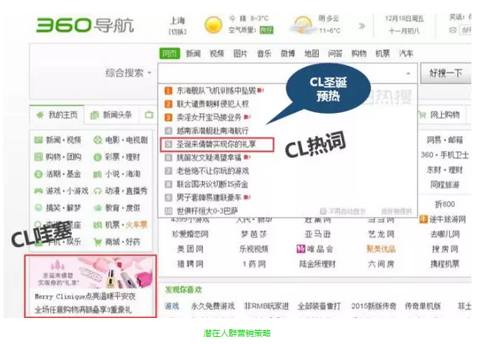 针对潜在人群:通过搜索大数据综合分析发现,雅诗兰黛女性用户比例高于全体网民,较高比例的年轻化用户亦代表未来市场消费主力,作为大规模流量平台与雅诗兰黛整体人群契合度较高,360行为链大数据在这个过程中为雅诗兰黛整个营销方案提供了精准策略支持。导航首页哇塞&热词:圣诞前期,借助导航首页的大规模曝光对潜在用户进行活动预热,短期内快速触达潜在用户并获得大规模官网访问量。