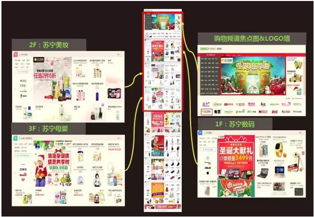 除了首页资源,深耕购物内页资源投放,有效抓取精准购物人群,补充流量获取缺口承载日常流量层的10%流量需求。在购物频道内页的搭建上,苏宁独占前四个楼层及焦点图、logo墙等核心资源,对全站精准流量进行了全面的捕获。