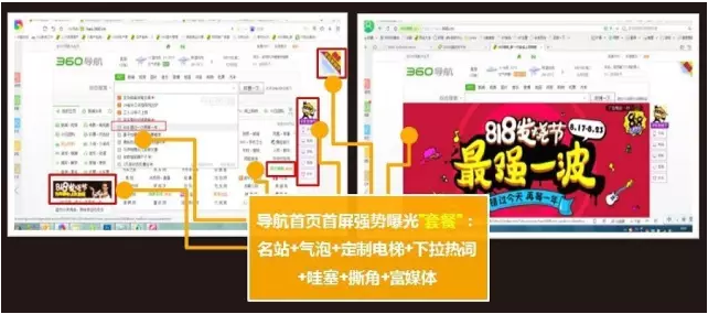360导航作为日均PV达到6.77亿的中国上网入口,在投放时经常会出现自己过“生日”资源被人占,资源被竞品的节日活动抢光,影响活动的力度与效果。在818苏宁易购周年庆当日,360推广为苏宁定制了首屏套餐,保障导航首页活动资源全覆盖,电梯富媒体资源效果显著,实现预热及高峰期流量的导入。