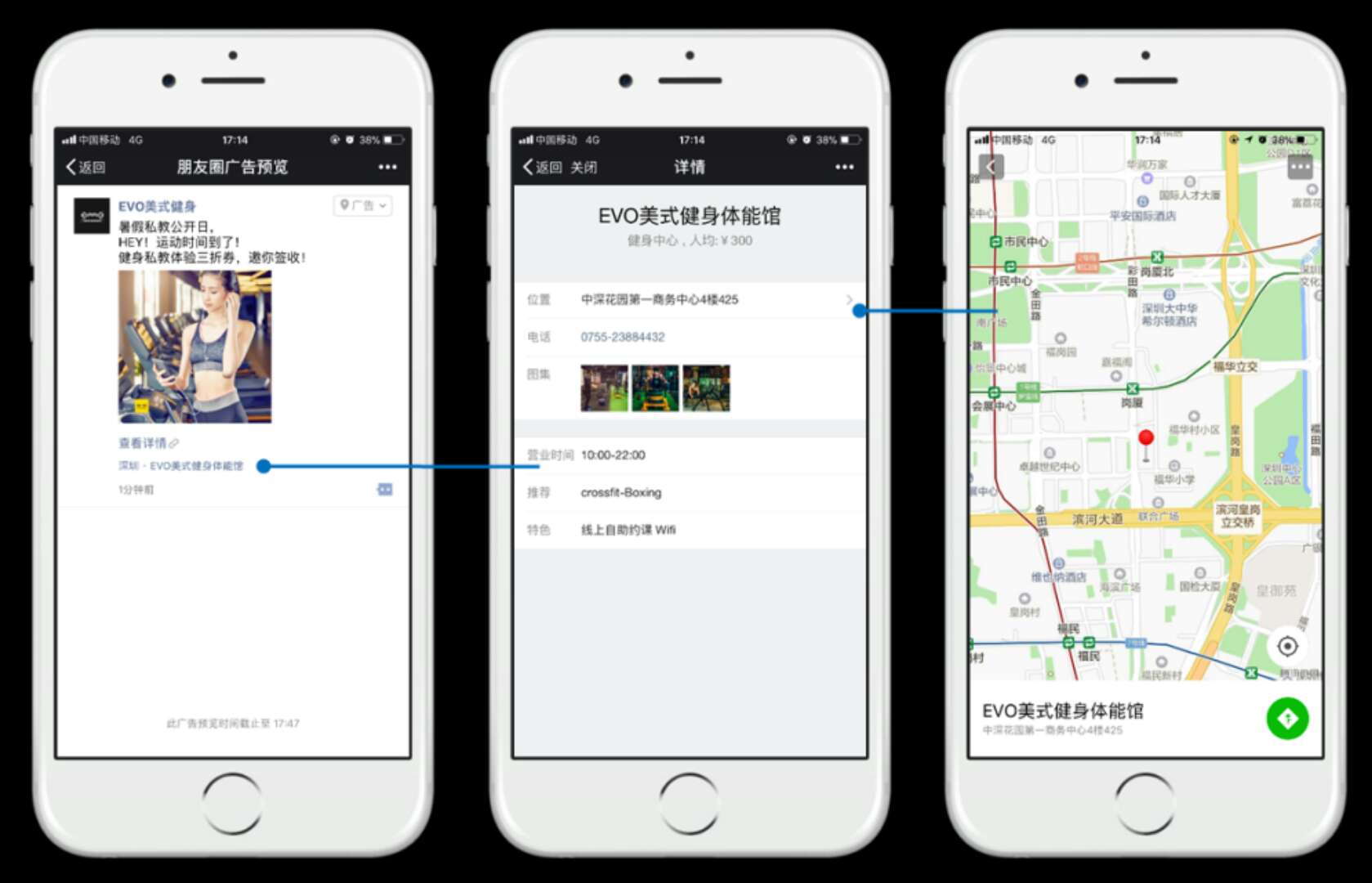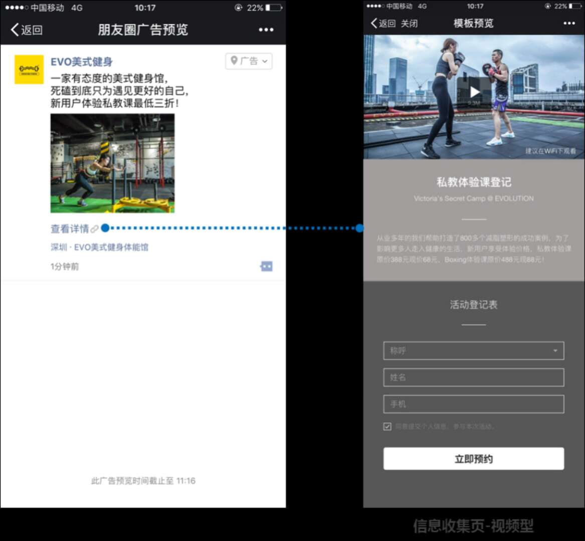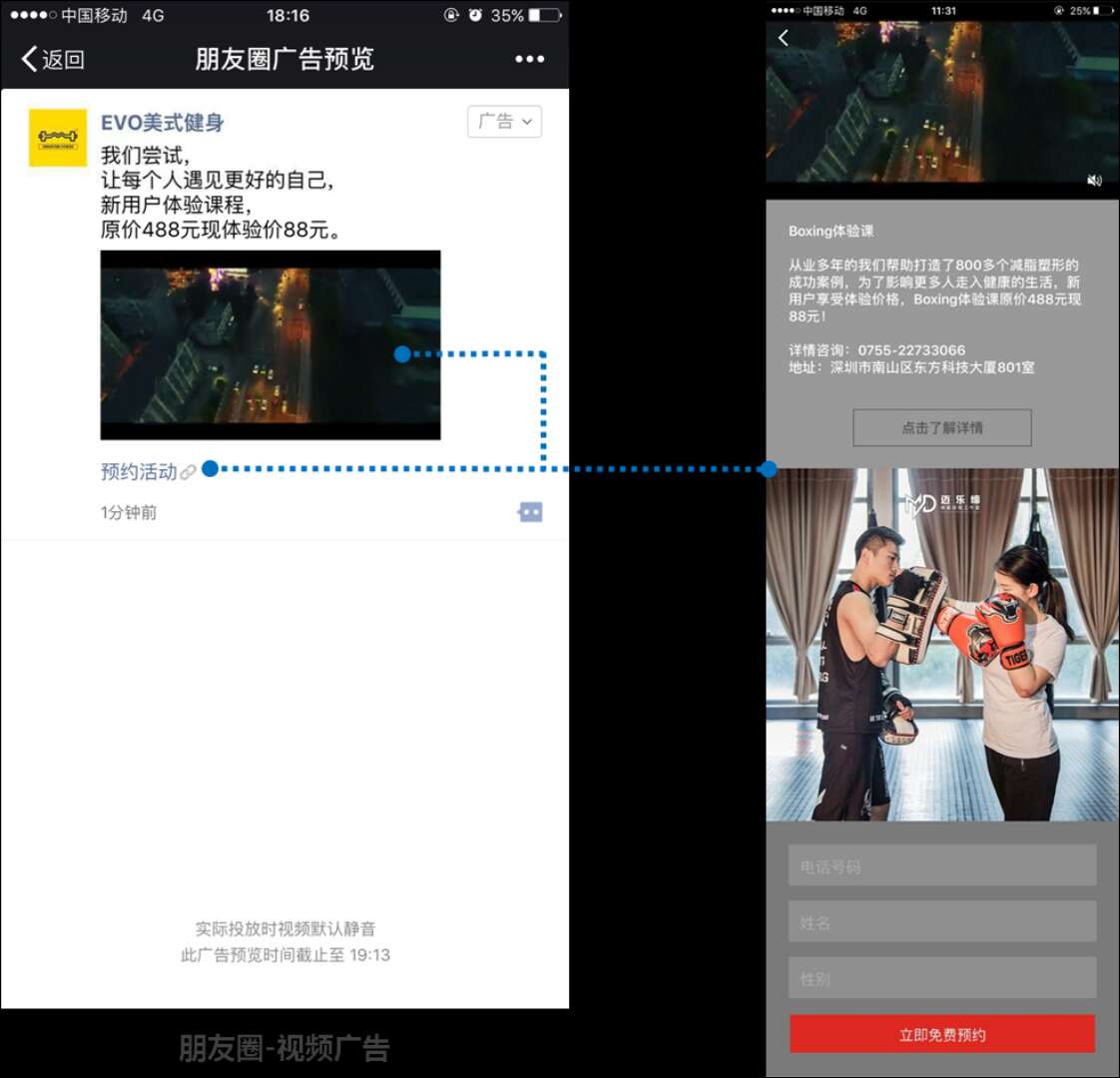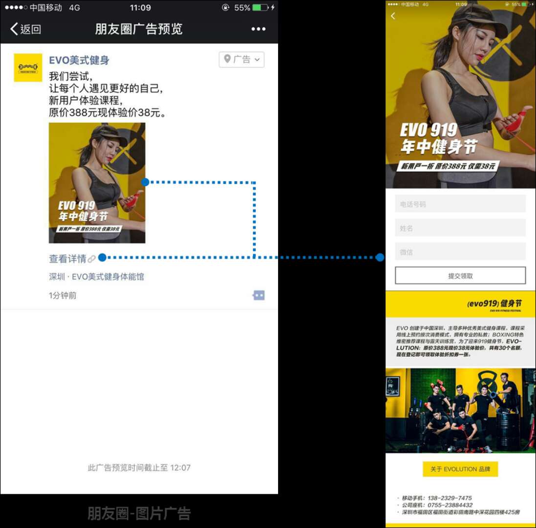 微信拥有9.6亿的月活跃用户,朋友圈广告大曝光、强社交属性贴合运动健身行业广告主需求,该行业投放广告的目标用户有到店距离的考量,本地推广LBS能精确辐射周边0.5km-5km,灵活打点精准触达;外显的门店地址能强化用户对于门店的感知,点击进入可查看门店信息,并提供实时导航。