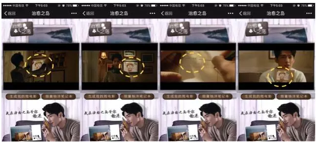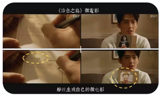 我们可以看到《治愈之岛》微电影里有些镜头与粉丝生成的微电影在画面上相呼应,这使得感人的故事情节可以为活动参与提供强大助力,大大提升粉丝的卷入度。