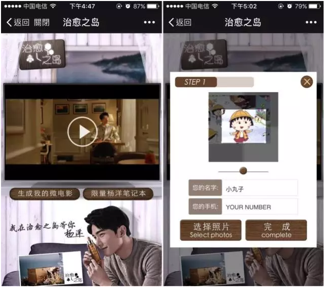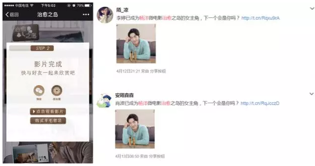 粉丝可以在观看《治愈之岛》微电影后,通过在专题页扫二维码或者朋友的分享链接进入微电影互动界面。