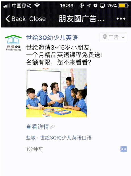 此次腾讯社交广告推广主要是为世绘3Q盐城地区分部进行学员招募,所以在推广时主要覆盖了世绘3Q盐城分部门店半径5公里内的范围,以及门店附近的中小学、居民社区等。同时,为了更好地拉近品牌与用户的距离,世绘3Q使用了朋友圈本地推广广告的形式,将品牌名称显示在了外层素材下方。