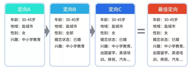 如图所示,优化师设置了三组不同人群定向,同时投放了两组创意素材。经过测试,定向C相对效果佳,于是确定了定向C为zui后的定向条件。