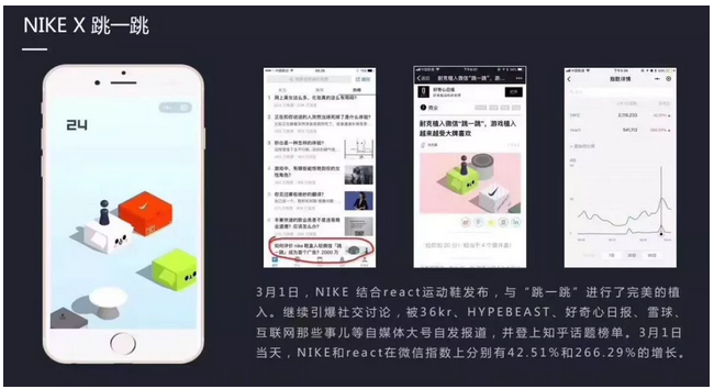 3月初,微信小游戏 " 跳一跳 " 上线了耐克广告,据说此广告是以2000万的成交价拍出的,广告形式为:出现在至少 5 个 " 桥墩 " 之后,跳之前是品牌色和 Logo,小 "i" 跳上去之后,盒子变色,出现了 "nike react" 字样的广告。