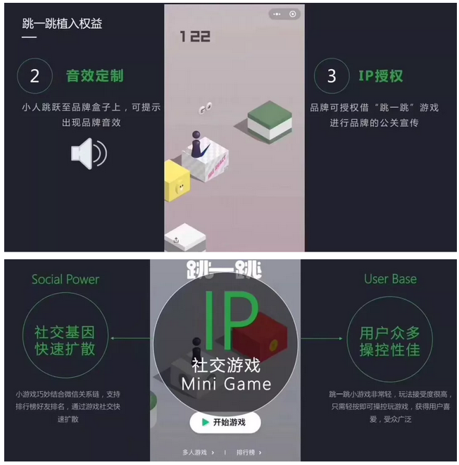 微信小游戏是在2017年12月28日上线,借助了微信开屏推广,迅速成为微信又一极具商业价值的产品。当时,就有很多人猜测,这种轻度过关类的小游戏,非常容易商业化,比如跳一跳的每个 " 桥墩 ",其实已经在后期加上了包括 " 微信支付 " 字样的推广。当然,用户的想象力更大,比如小 "i" 跳到一个标有网易云音乐的播放器上,可以给自己点一首歌。没记错的话,前段时间还有一波品牌,做了 " 跳一跳 " 的借势海报。