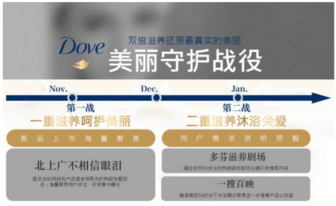 现代女性面对逐渐加大的社会压力,正在寻求更加便捷的物质消费方式和心灵慰藉方式。譬如说,人们追求身体滋养可能不会寄希望于每天一次的SPA,或许希望有一个同时兼有清洁和滋养的沐浴产品;而人们寻求心灵滋养也常常并不来自书籍或旅行,更多的是来自情感剧集或热门话题里的思想碰撞与思考。于是我们基于新品上市的营销任务,将“双倍滋养”的产品诉求转化为多芬对消费需求与情感需求的双重响应,通过分阶段分步骤的传播战役,强化多芬在身体和心理两方面的“滋养”、“呵护”,让消费者对从内而外的“双倍滋养”有更深刻理解和记忆。