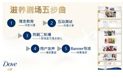 内容覆盖我们深度挖掘女性群体情感及物质需求,推出多芬滋养剧场。通过产品教育深入沟通信息,进一步传达多芬滋养美丽、关爱女性的理念。