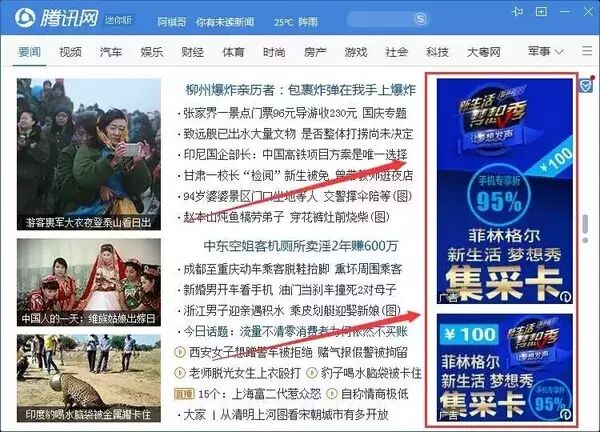 2)腾讯网迷你版,有坚栏、Button两个广告位置,用户一登录QQ就可以看到,如下图: