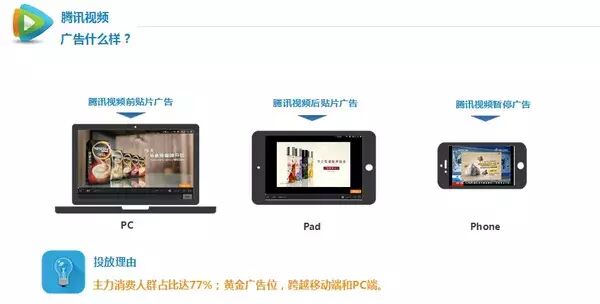 2、 腾讯视频推广(动态形)跨越移动端和PC端,多平台定向 :PC+Pad+Phone;支持定向(内容、时间、地域、性别、网络环境);据统计,腾讯视频使用人群占社会主力消费人群77%;黄金广告位,有前贴(15秒)、后贴(15秒)、暂停、移动端信息流四个体现位置,如下图:
