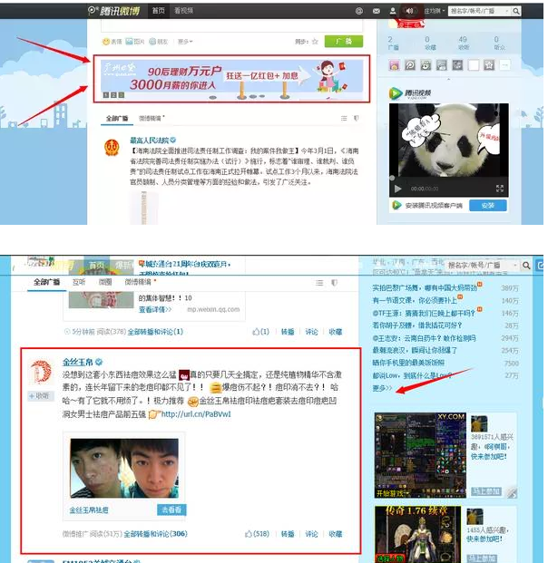 4、 腾讯微博,互动广告,有信息流(博文加图片)、右边图片广告两种体现方式,如下图: