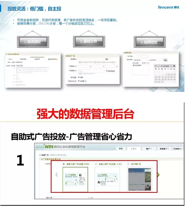【优势分析】无论上班一族,学生党,家庭主妇们,只要上电脑,打开腾讯QQ产品,那么他/她必定会是受到腾讯帝国不同产品的全方位的覆盖,所以,选择腾讯的好处就是,可以全方位地对一个潜在客户进去产品轰炸,灌输品牌意识,无论是在腾讯网,QQ空间,刷微博,看视频,听音乐,玩游戏等等……都可以播放你的广告!