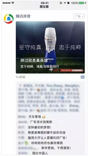 微信全幅式卡片广告的创新形式,在世界杯期间给众多用户眼前一亮的感觉,有效在微信朋友圈社交信息流环境下,以外层更大的全幅展示和内外层更好的衔接感通过与世界杯大IP的结合引得大批用户在互动评论中表达对于广告形式、内容和品牌的正面反馈。
