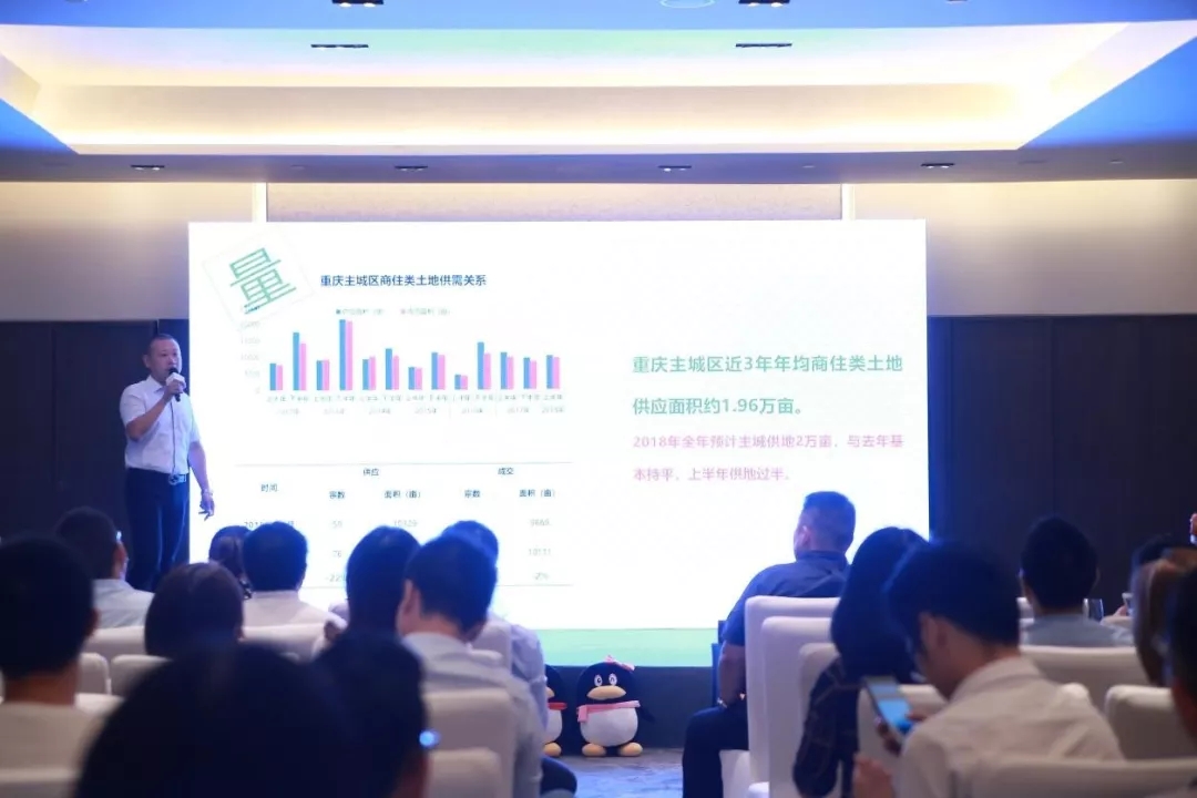 除了腾讯社交广告外,在各地峰会中,还邀请了很多知名的第三方机构,以重庆峰会为例,锐理数据重庆公司总经理陈冬旭表示,如果说2017年是剧变的一年,2018年则是蝶变之年。从2017年到2018年以来,整个重庆房地产市场从产品到区域发展,均处于迅速升级换代的过程。在政策上,上半年政策转向监管,保持发展基调,基本每个月都会有两到三条政策出台。在全国主要城市几乎均处于“四限”的大环境时,重庆却只有“三限”。陈冬旭认为,重庆没有实施限购政策的原因,与其当前发展阶段有着直接的联系,即“一带一路”及西部大开发的政策需要。这一点从占据了整个重庆GDP收入93%的基础建设投产比不难看出,作为中国最年轻的直辖市,重庆的起点低、空间大、有政策倾斜、进步快。