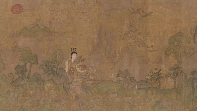 画中的洛神,出自《洛神赋图》,作者是顾恺之。在东晋之前,画家被认为是匠人,社会地位比较低,没有名字留下来。在顾恺之后,情况为之一变。琴、棋、书、画成了文人雅士所推崇的对象。因此,顾恺之成为了中国艺术史上第一位有名、有姓,并且还有图像流传下来的艺术家。