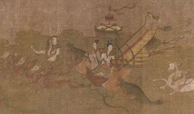 在接下来的画面中,女神她坐上云车向曹植告别了。她的云车等级很高,有六匹龙拉着。在古代,车辆的建制有森严的等级,在人间,只有天子可乘六马车。洛水女神乘坐六龙云车,旌旗飘飘,云水翻腾。车身四周有众多水族护卫。有长着翅膀的文鱼、白色的蛟龙、双头神兽,凡人不敢靠近。