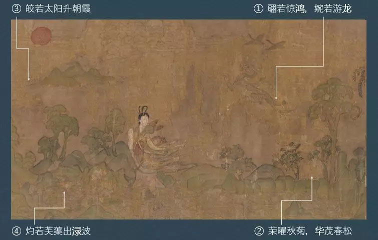 在仙子的脚下,有荷花绽放,顾恺之用这些美丽的花朵来烘托这位动人的仙子。