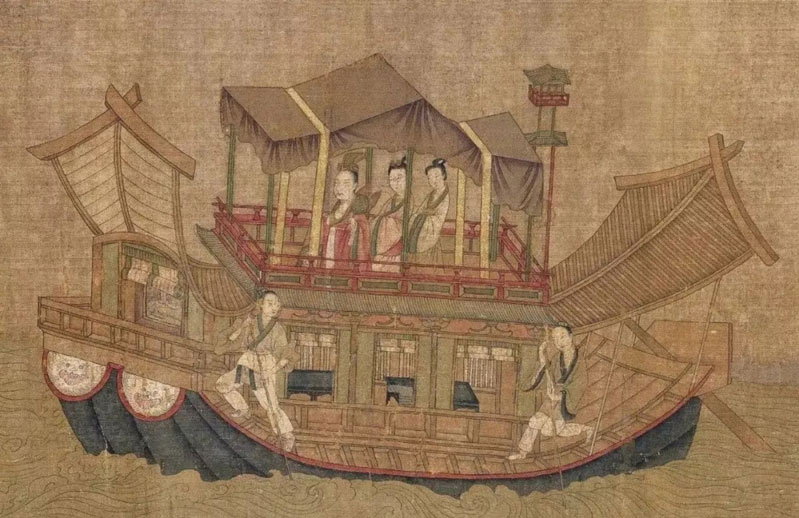 曹植深爱着洛神,他手执羽扇,不甘心就此放手。于是他让手下划船追赶。