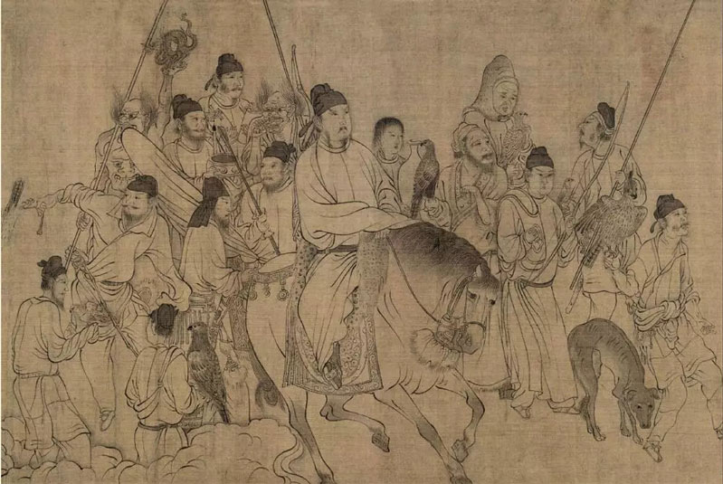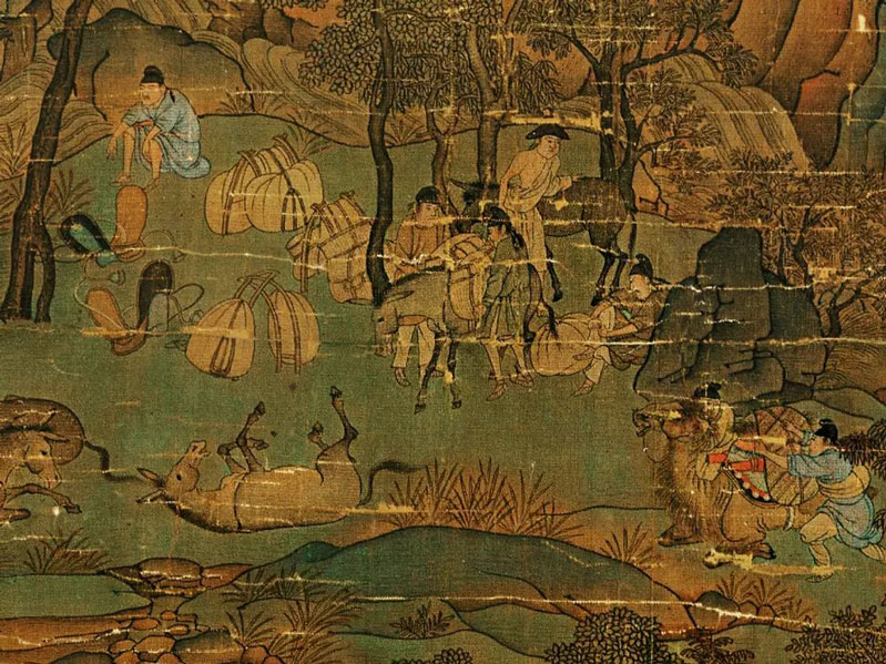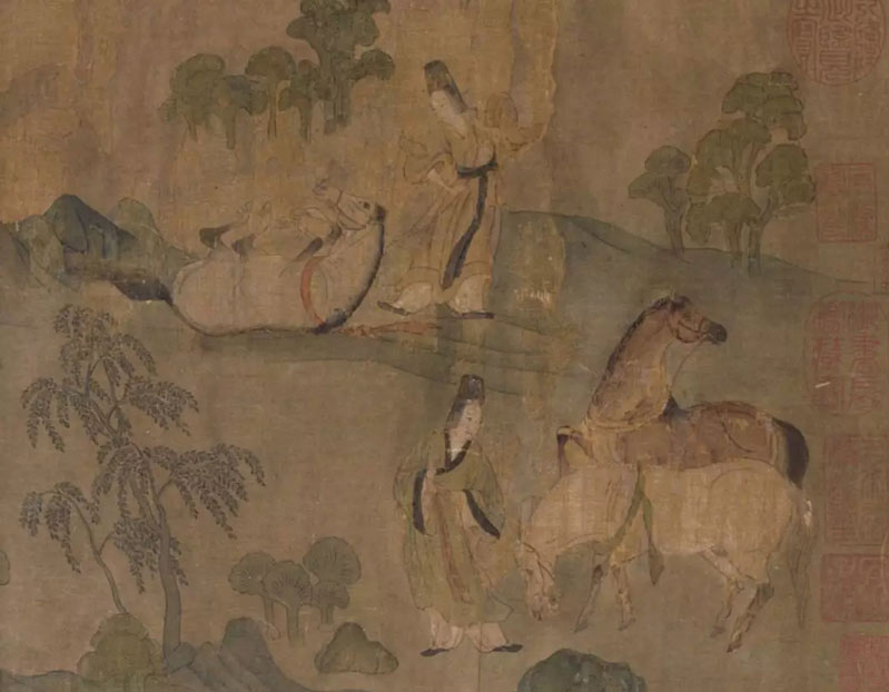 首先,我们来看这幅画的“开篇”:这是曹植,在京师告别了他的哥哥——皇帝曹丕之后,跋山涉水前往自己的封地东阿。由河南洛阳至山东东阿,一行人走得人困马乏,刚至洛水,曹植的随从和他的马匹便准备休息。