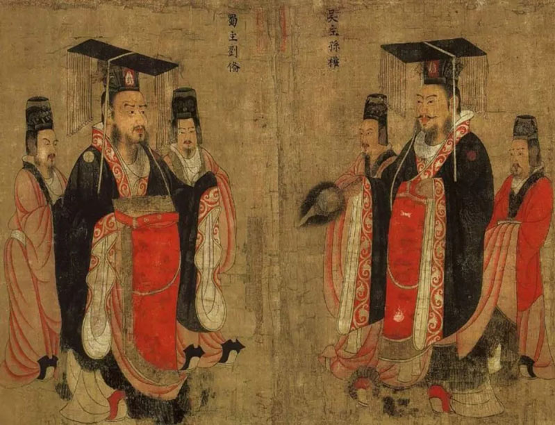 唐朝阎立本的《历代帝王图》中的刘备像和孙权像(如下图),他们都是这样被侍从扶着的。