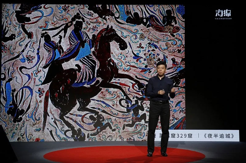 莫高窟里还有一幅画:329窟的《夜半逾城》。画的是佛祖释迦摩尼出城修佛的故事。有一天半夜,他下决心要离开都城出去修行。当他骑马跨过城墙的这一刻,有四位大力神拖着他的马蹄腾云驾雾,他的身边还有很多的飞天。在他的前面,一只豹子在开路。这些神、鬼、兽都是来烘托释迦摩尼决心弃绝尘世,潜心修行这件事,因为描绘的是佛教历史上的一个伟大的时刻。
