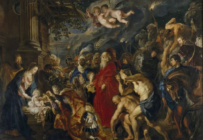 其实西方绘画中也有类似的传统,以常见的“耶稣降生”题材为例,1609年鲁本斯的《三圣贤的朝拜》,描绘的就是耶稣基督降生的景象。众多的先知、神人、天使前来觐见。用神仙“加持”的方式来表现伟大的时刻,东西方美学真是殊途同归了。