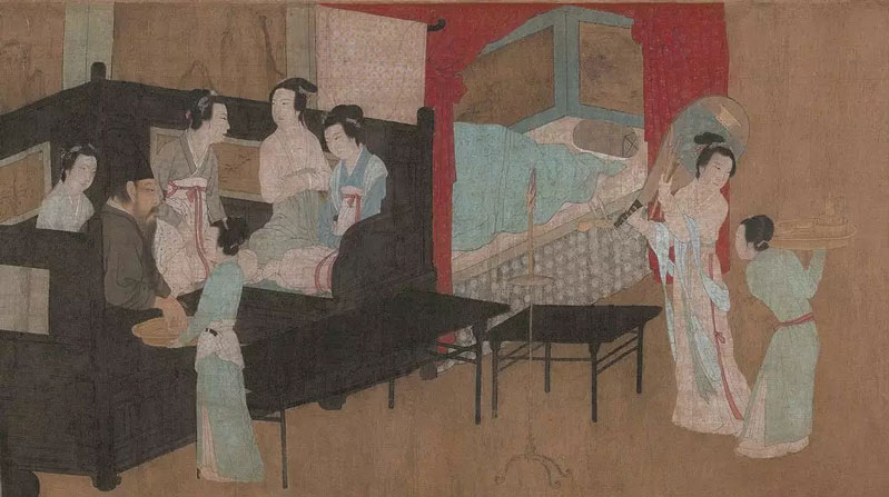 例如南宋的《韩熙载夜宴图》(上图)中,主角韩熙载坐床上,面前的歌妓刚刚弹完琵琶归来,坐中有一个高高的火炬,我们就知道,原来这是一场夜宴。