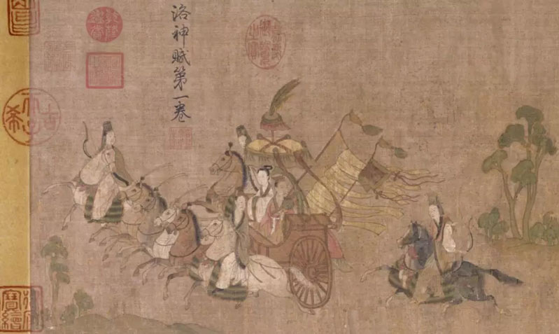 大家可以看到,曹植的马车是四匹马拉的。因为六匹马的马车是他的皇帝哥哥才能坐的。车的样式很像刚才洛神离开时的样式,只不过洛神乘坐的是云车,曹植回首顾盼,他希望还能再看女神一眼。手上还紧紧地拿着那个小扇子。我想他这一辈子都不会放手,因为这是洛神留给他的唯一信物。画卷就到这里结束了。