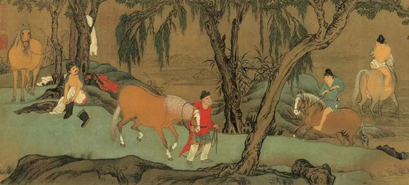 赵孟頫的《浴马图》(上图)也是如此,牧马人上岸以后一边穿衣服,一边回头看,画卷就此结束。这是一个非常好的结束方式。