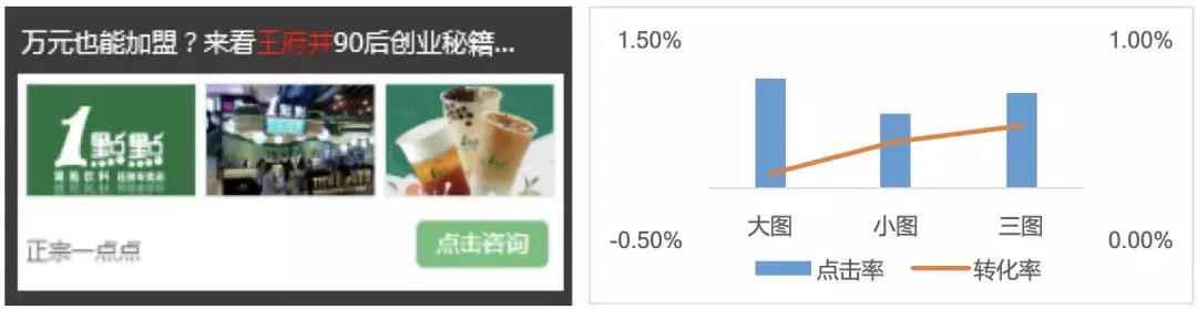 eCPM:广告平台竞价的排序依据,千次展现收益,经测试低于3元将无法正常出量。pCTR:预估点击率。可以直接参考账户现有CTR数据。点击率影响因素为人群&素材,第二阶段人群主要由系统算法判定,所以重点应对素材进行优化提升CTR。建议一周2-3套为宜,可以新建推广组或者复制效果好的推广组。pCVR:预估转化率。可参考账户现有转化率(推广组-自定义指标-转化率),或者通过公式计算得出。转化率影响因素主要为人、素材及落地页。人群和素材同上,重点优化落地页是提升CVR的重点。经测试,双表单和转盘样式更有优势,提升客户线索提交率18%左右。CPA:目标转化出价。因为第一阶段设置目标转化成本不生效,所以可先设置为目标成本的2倍,第二阶段目标转化成本开始生效,可设置为第一阶段实际成本的1.2倍,稳定投放2-3天后,逐步调整为目标成本。其次,第二阶段恢复目标成本。避免频繁调整,调整频次3-5天即可。以某广告主为例,经过优化,3个指标数据如下:【3图样式】233模型中第二个“3”指的是创意层级三图样式。经唯一变量测试后,小图、大图、三图样式中,三图样式转化不错,同时结合创意通配符,可以大大提升点击率。在有限的文字和图片里面,如何吸引用户的注意、激发用户的点击欲望是众多广告人都在思考的问题。然而信息流广告优化中,任何定向、物料都不能一劳永逸,需要不断测试,找出优质人群、定向方式、创意和LP才是王道。