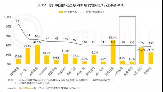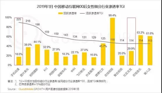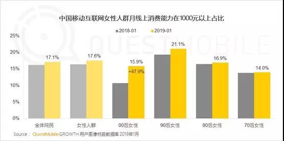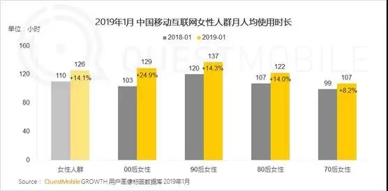 据QuestMobile数据显示,移动互联网女性人群总体规模5.31亿,同比增速6.7%(高于整体的4.0%)。其中,00后、70后基数低但增速快,90后虽然增速下滑,但在整体时长上,90后一骑绝尘、遥遥领先,月度使用达到137个小时。在人均使用app数量、消费能力上,90后同样遥遥领先……而在APP使用习惯及偏好方面,女性拍照必修图,且对动漫、购物、交友、外卖有明显偏好。90后更注重关注健康、社交及购物的精打细算。“二次元”“腐”“小圈层文化”在00后女生中得以凸显,虽然身在校园中,但是00后热衷手机动漫、爱看视频、兴趣交友“混小圈子”