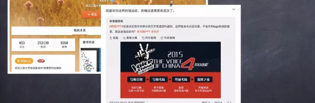 这个微博是一个垂直做PPT教学的老师,他可以利用微博这个平台去承载他和学生的沟通。他在和同学沟通的过程中,新的用户可也从中看到沟通的价值。