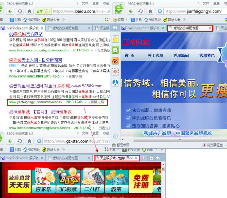 一个正常的卖减肥药的正规网站,被黑客入侵,并植入了一个赌博网站的推广内容,并且已经被搜索引擎抓取到了。