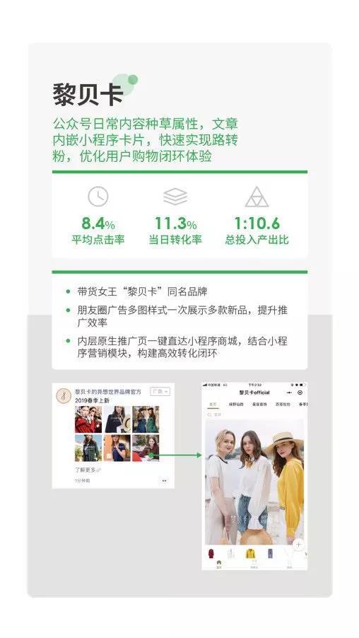 黎贝卡official小程序选择了投放微信广告。2018年12月,黎贝卡official进行了一次派对主题上新,借此机会尝试投放了朋友圈广告,ROI就达到了20以上,这让团队对微信广告的转化效果产生了信心。此后,黎贝卡official加大了广告投放的频率,并陆续投放了公众号底部广告、公众号互选广告等多种资源位,均获得了不错的效果。