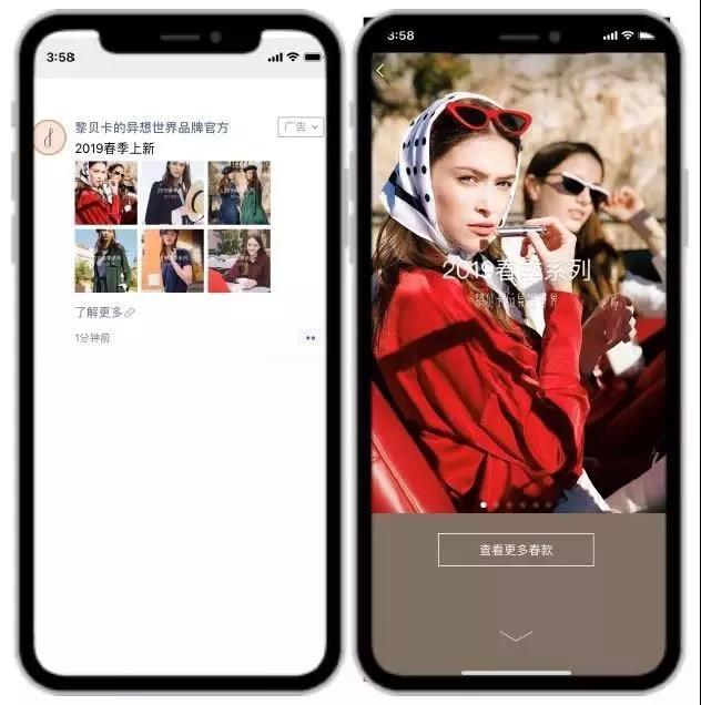 从黎贝卡official2019年春季上新投放的朋友圈广告可以看出,在外层素材和落地页设计上,采用了与品牌调性高度契合的时尚风格,符合目标人群的喜好,内层落地页可跳转小程序商城。