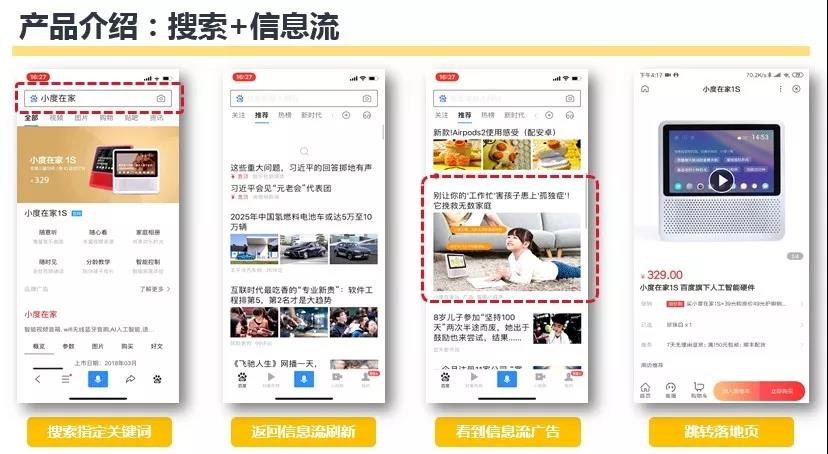 “搜索+信息流”联动,在用户打开百度app搜索过品牌或者产品相关关键词后,再回到信息流浏览资讯,就会再次看到相关品牌产品的信息流广告,帮助用户行成购买决策。