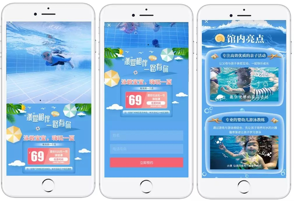 3、内层广告素材选择敞亮干净的场馆设施图、儿童游泳的特写图、动画样式的排版搭配,从专业、信任、童趣三个方向打动人心。