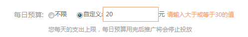 ❤ 计划预算:推广计划每天的支出上限,每日预算用完后推广计划将会停止。范围(1000000≥预算≥ 30)投放最低 30 元。如所填数值不符合要求,系统会有如下提示。