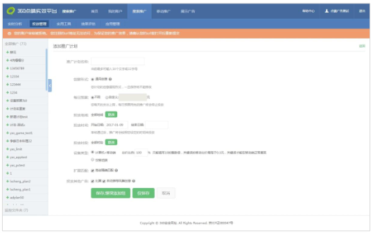 360推广计划是指管理一系列关键词、创意的大单位,建立360推广计划是设计账户结构的第一步,每一个推广计划拥有单独的投放预算、投放时间和投放地域。