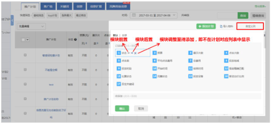 登陆后,点击“搜索推广”,选择“投放管理”的“推广计划”层级。可通过“自定义列”功能,实现个性化定制查看计划对应内容的需求。不仅能够灵活调整查看内容列表,还能够自由调整列表内容先后顺序。