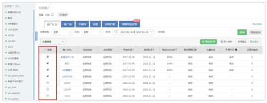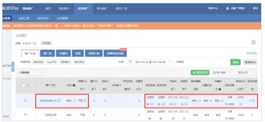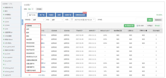 再通过“批量编辑”实现对多个推广计划进行“启用、暂停、删除、修改预算、修改投放地域、修改投放时段、修改开始时间、修改结束时间、修改移动出价比例、设置高级精确匹配、设置比翼开关、设置凤舞开关、设置否定关键词”的调整及修改。