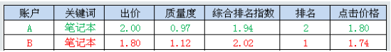 正如下表中 B 账户,虽然出价不高,但由于质量度高,可以得到首位的排名,并且点击价格比排名第二的 A 账户还要低。