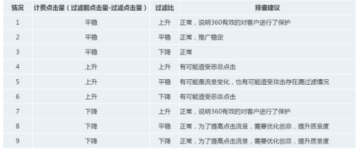 不同账户之间的过滤比绝对值没有对比价值,查看本账户多日数据分析变化趋势。在对推广设置未进行大量修改时可参考下表进行基础排查: